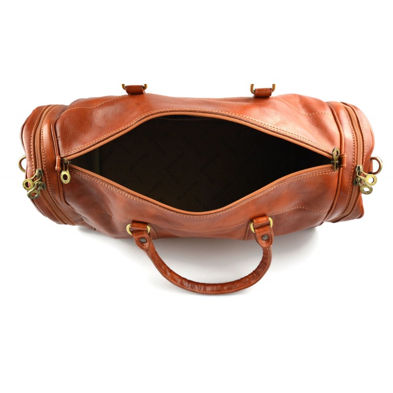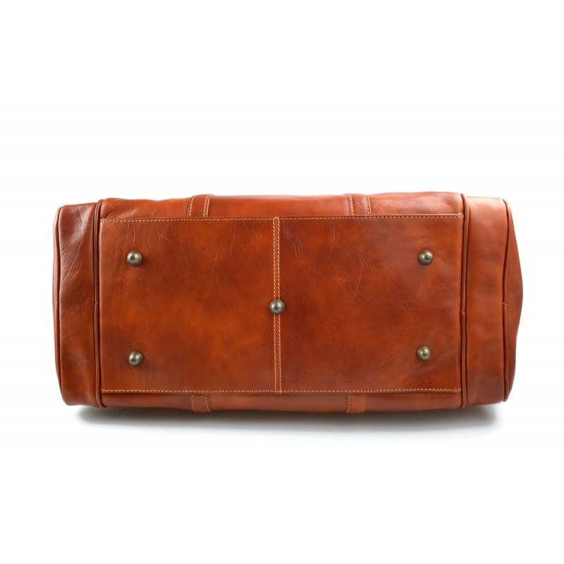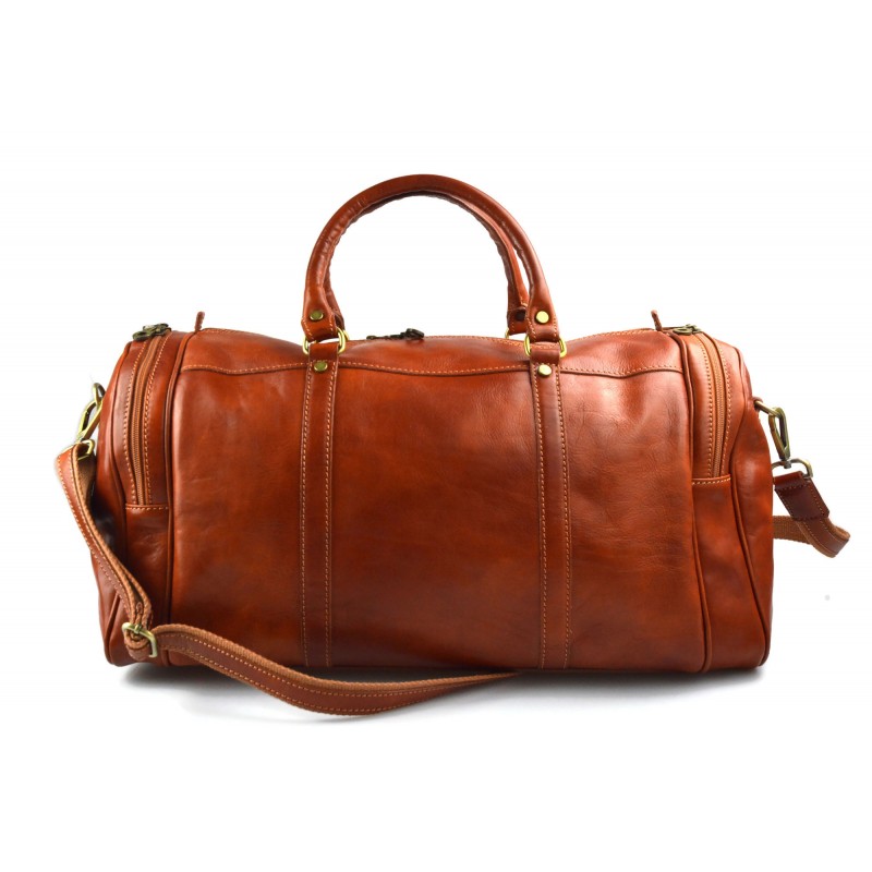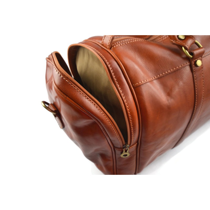 Metropolitana buscar esta bolsa de viaje hermoso. Hecho con cuidado extremo, cuero genuino, cuidando cada detalle. Dos cómodos bolsillos laterales con cremalleras con etiquetas de cuero, costura en color de contraste, cortes de juego, costura y remaches de latón para embellecer el modelo. La bolsa tiene dos asas robustas unidos a anillos de bronce, y la correa de hombro desmontable.