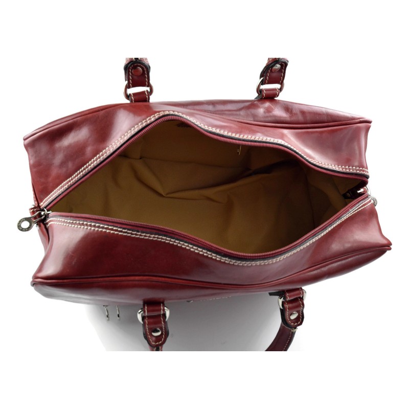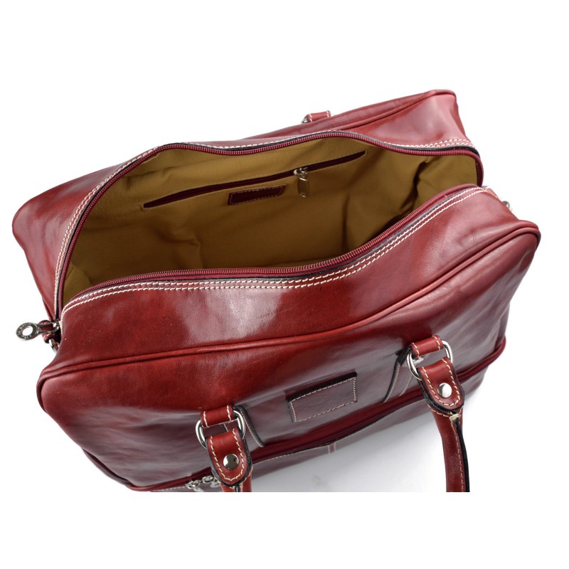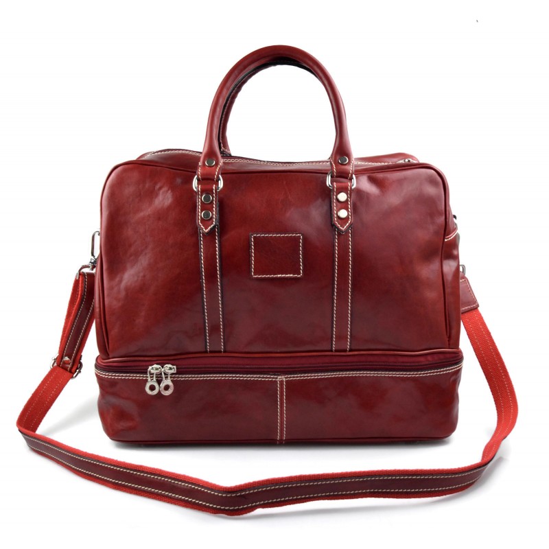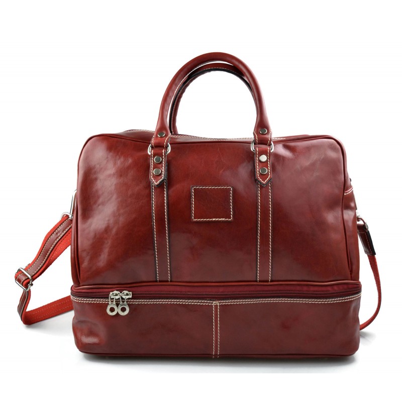 Magnifico borsone in vera pelle, resistente e durevole nel tempo. Curato in ogni minimo dettaglio, è pratico grazie anche allo scomparto con cerniera posto al fondo del borsone. Con tracolla removibile e manici agganciati con robusti anelli.